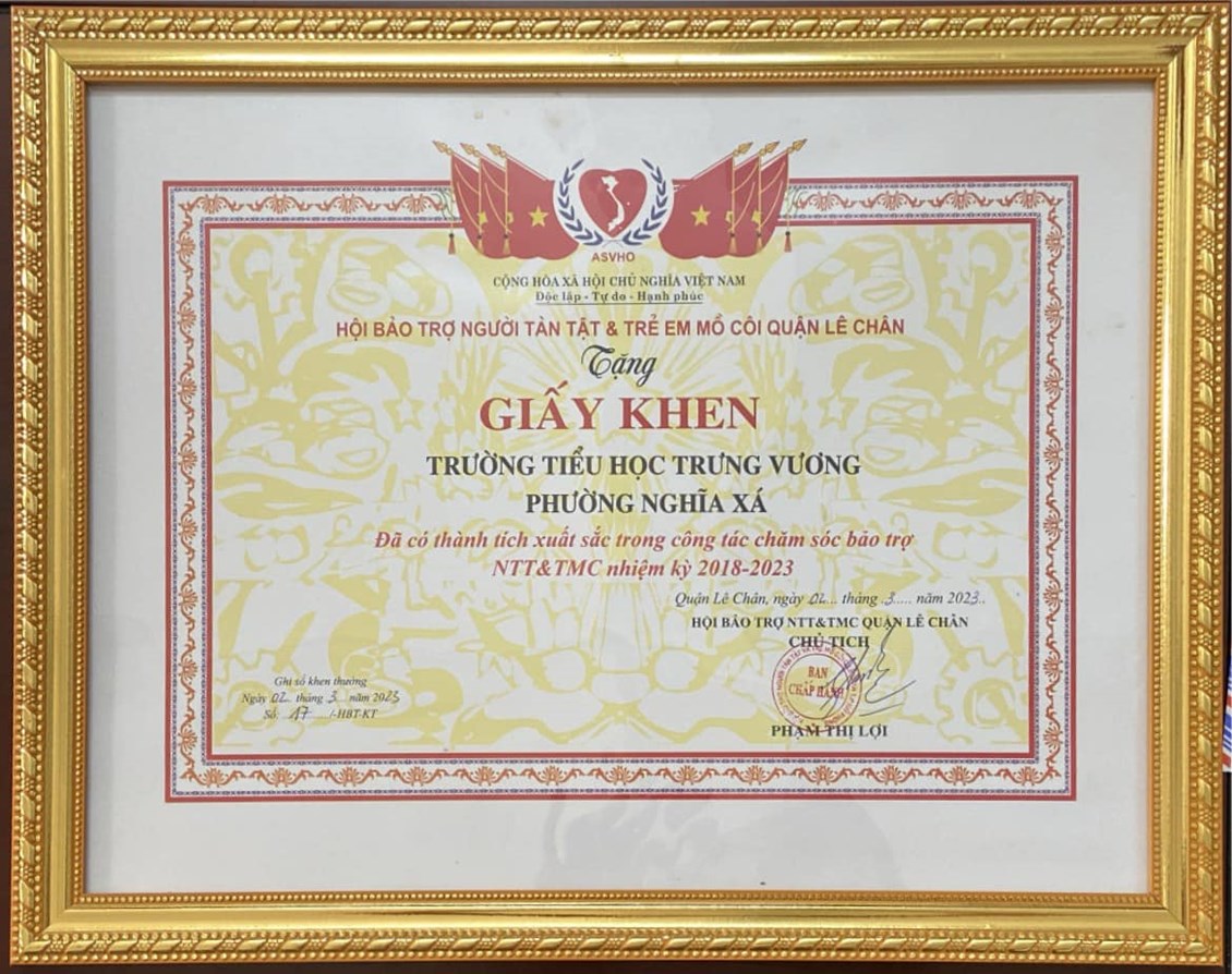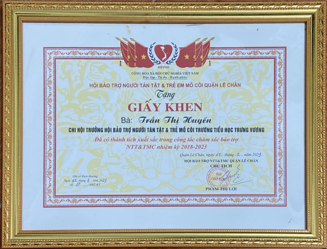 Phần khen thưởng, tại quyết định số 17, ngày 02 tháng 3 năm 2023, do bà Phạm Thị Lợi - UV BTV thành hội - Chủ tịch Hội Bảo trợ NTT&TMC quận đã ký quyết định tặng giấy khen cho tập thể nhà trường và đồng chí Trần Thị Huyến - Chi hội trưởng chi hội Bảo trợ trường tiểu học Trưng Vương đã có thành tích xuất sắc trong công tác chăm sóc Bảo trợ NTT&TMC nhiệm kỳ 2018 - 2023.