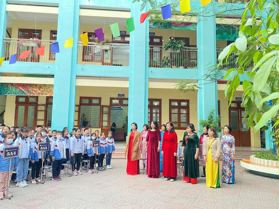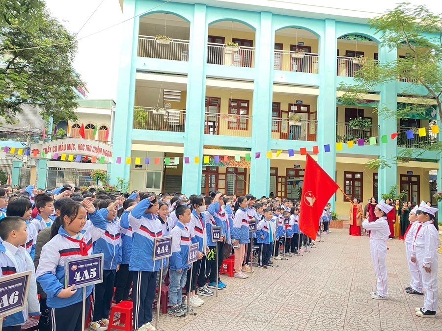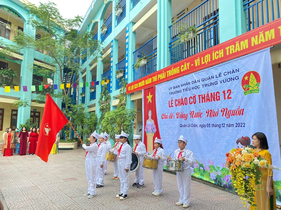 Dưới lá Quốc kì, học sinh hát vang bài hát Quốc ca và Đội ca. Sau lễ chào cờ, cô giáo TPT Đỗ Thị Hồng Vân đã tổng kết kết quả hoạt động của Liên đội trong tháng 11 đã thực và triển khai kế hoạch tháng 12. Tuyên dương các cá nhân và các tập thể đã có nhiều thành tích trong tháng 11: