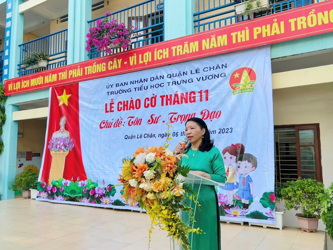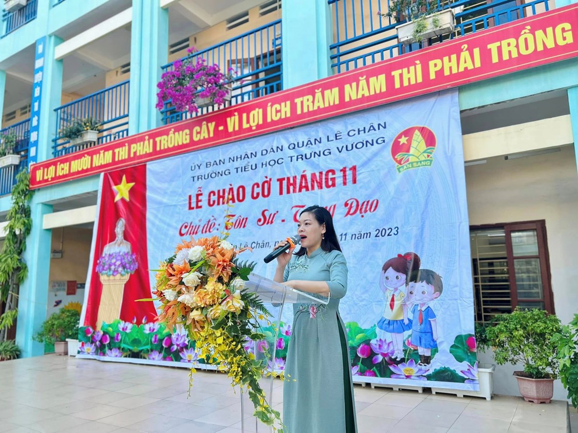 Về dự với lễ chào cờ ngày hôm nay có cô Đồng Thị Lan - Bí thư chi bộ, Hiệu trưởng nhà trường cùng các thầy cô trong BGH, Hội đồng giáo viên nhà trường. Và đặc biệt là sự có mặt của tất cả các em học sinh của trường Tiểu học Trưng Vương.