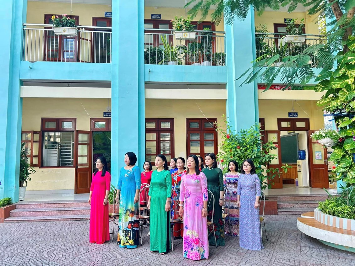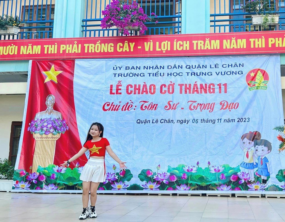 Mở đầu chương trình là tiết mục Nhảy “Gọi tên Việt Nam” của bạn Quỳnh Anh lớp 5A6. Tiếp đến là phần nghi lễ chào cờ, hát Quốc ca, Đội ca diễn ra trong không khí trang trọng. Giáo viên và học sinh toàn trường đứng nghiêm trang, cùng hướng nhìn về lá cờ Tổ quốc đang tung bay trong gió.